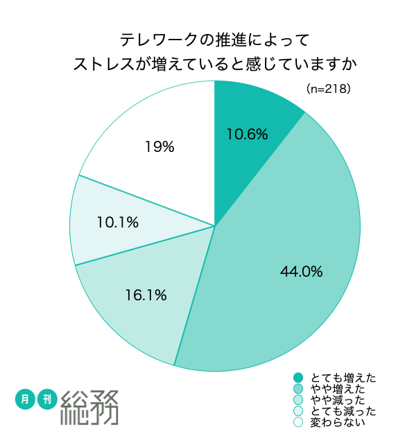 『月刊総務』の調査によると、「テレワークの推進によってストレスが増えていると感じていますか」の質問に対して「とても増えた」「やや増えた」が合わせて54.6%、半数以上の総務がストレスが増えたと答えています。