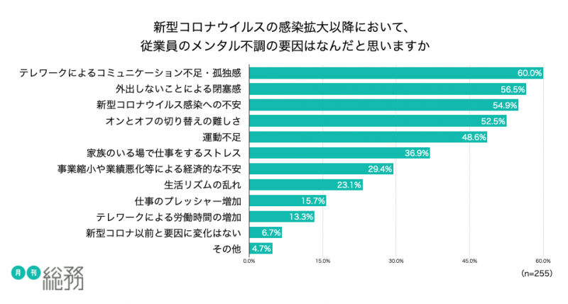 また、「新型コロナウイルスの感染拡大以降において、従業員のメンタル不調の要因が何だと思うか」をの質問の結果は「テレワークによるコミュニケーション不足・孤独感」が60.0%で最も多いという結果が出ています。